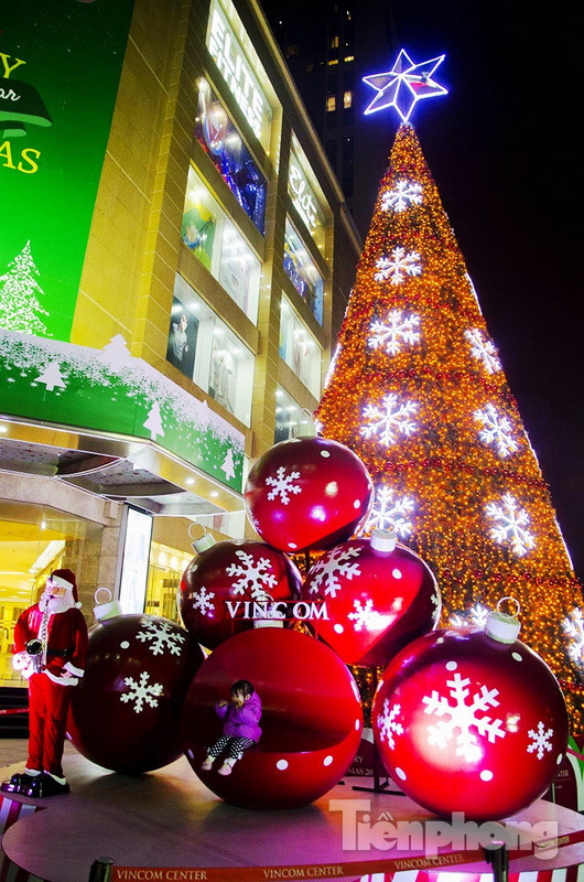 Bên cạnh cây thông khổng lồ là những quả cầu màu đỏ điểm những bông tuyết trắng cùng ông già Noel để mọi người chụp ảnh.