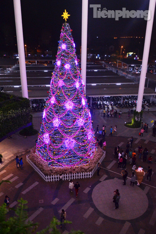 Cây thông Noel cao 15m nằm tại trung tâm thương mại Aeon Mall Long Biên được trang trí bằng dây thông, đèn led, hoa sakura, trái châu...