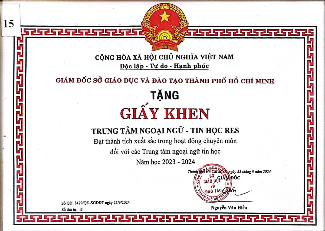 Trước đó không lâu, vào ngày 10/9/2024, hệ thống anh ngữ RES cũng đã xuất sắc vượt qua hàng ngàn cơ sở giáo dục và bộ tiêu chí thi đua khen thưởng khi được vinh dự nhận được giấy khen từ Sở GD&ĐT TP.HCM về thành tích quản lý và điều hành xuất sắc.
