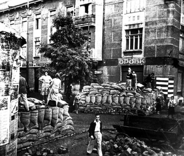 Người dân lập chướng ngại vật bằng bao cát trên đường phố Odessa.