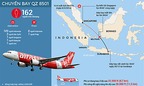 Ngày 28/12, chiếc máy bay mang số hiệu QZ8501 của hãng hàng không AirAsia, chở theo 162 người, bị mất tích khi đang trên đường bay từ Indonesia tới Singapore. Các cuộc tìm kiếm đang được ráo riết thực hiện. Người đứng đầu lực lượng tìm kiếm Indonesia cho biết máy bay có khả năng "đang nằm dưới đáy biển". Nếu điều này là thật, nỗi đau buồn của ngành hàng không trong năm 2014 lại được nối dài. Đồ họa: Việt Chung/ VnExpress.
