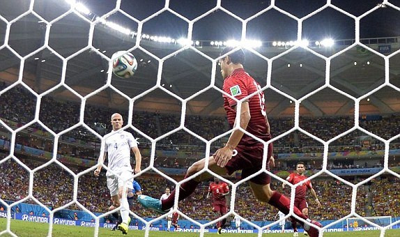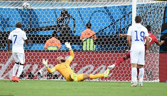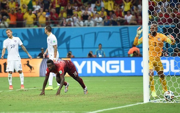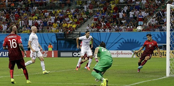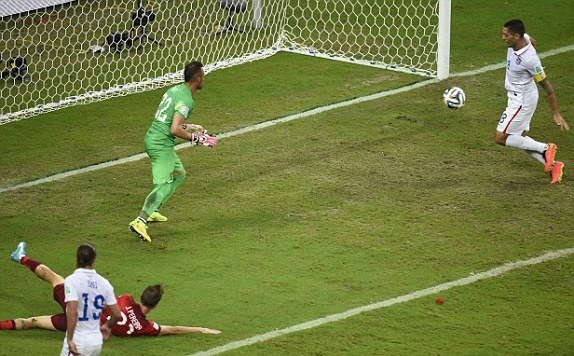 Một pha bỏ lỡ đáng tiếc. Michael Bradley đá nhanh vào khung thành gần như bỏ trống của Mỹ nhưng Ricardo Costa kịp lăn xả phá bóng bằng chân ngay trước vạch vôi.