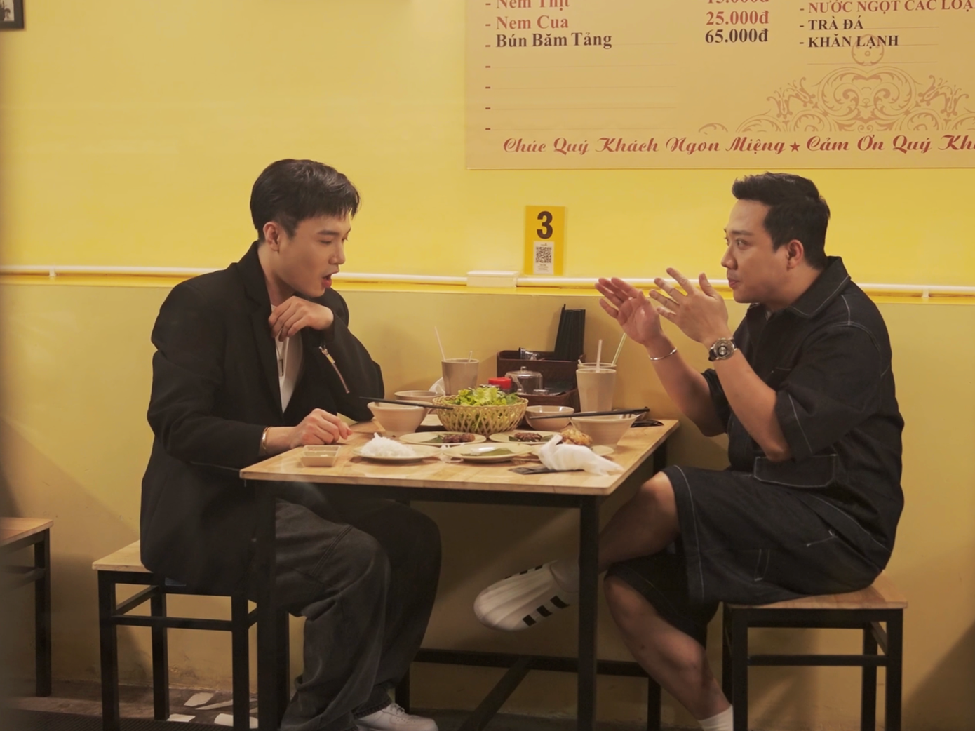 Trong lúc vừa thưởng thức đồ ăn, vừa tâm tình, Phạm Thanh Duy chia sẻ nghe lời khuyên của Trấn Thành quyết định Nam tiến để tập trung xây dựng sự nghiệp nghệ thuật là một quyết định đúng đắn.