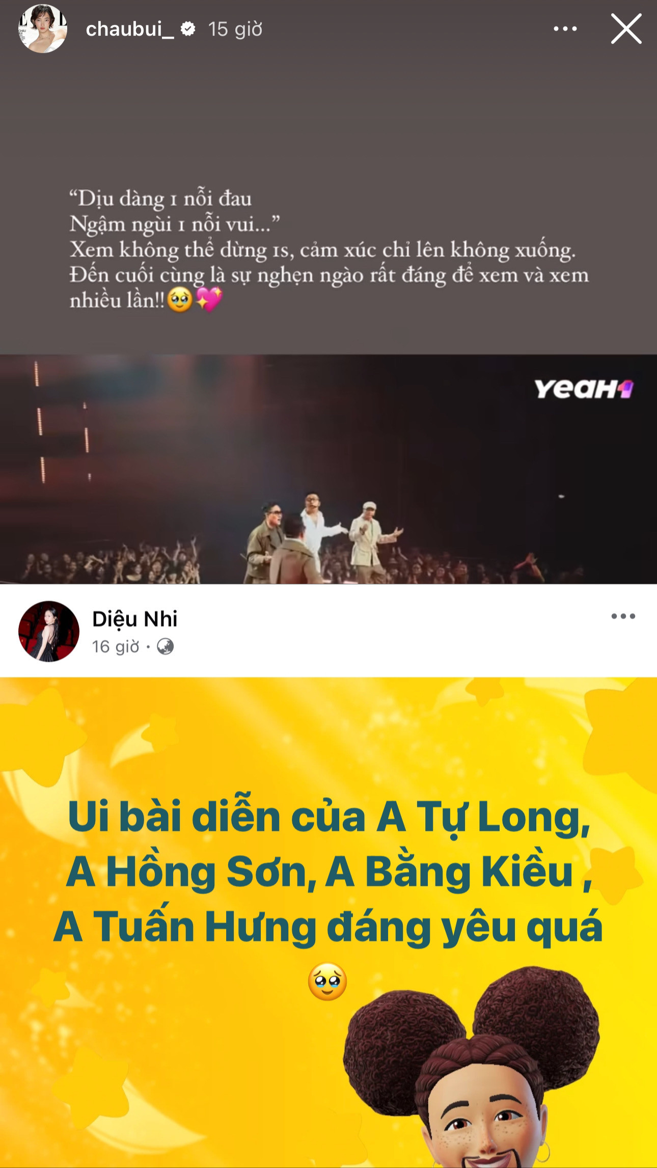 Ngay sau khi tiết mục của nhóm "huyền thoại" lên sóng, loạt sao Việt tỏ ra phấn khích. Chia sẻ trên Story, fashionista Châu Bùi cảm thán: "Xem không thể dừng 1 giây, cảm xúc chỉ lên không xuống. Đến cuối cùng là sự nghẹn ngào, rất đáng để xem và nên xem nhiều lần". Trong khi đó, Diệu Nhi đăng tải dòng trạng thái bày tỏ sự yêu thích: "Bài diễn của anh Tự Long, anh Hồng Sơn, anh Bằng Kiều, anh Tuấn Hưng đáng yêu quá."