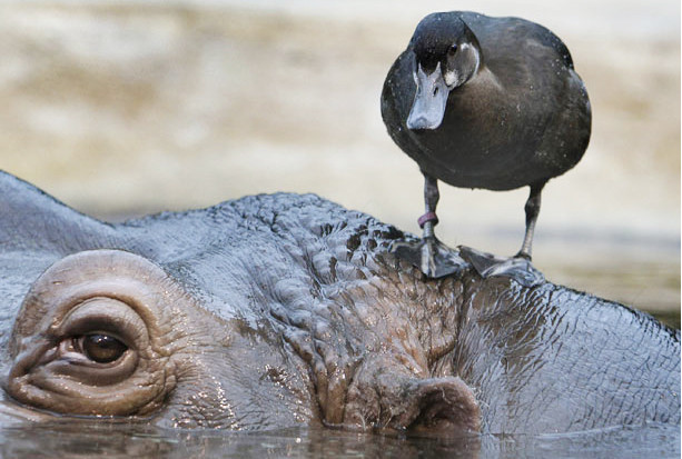 Vịt trời đứng trên đầu hà mã tại vườn thú Berlin, Đức.