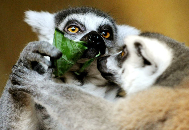 Hai con vượn cáo đuôi vòng thưởng thức món salad tại vườn thú Hagenbeck ở Hamburg, Đức.