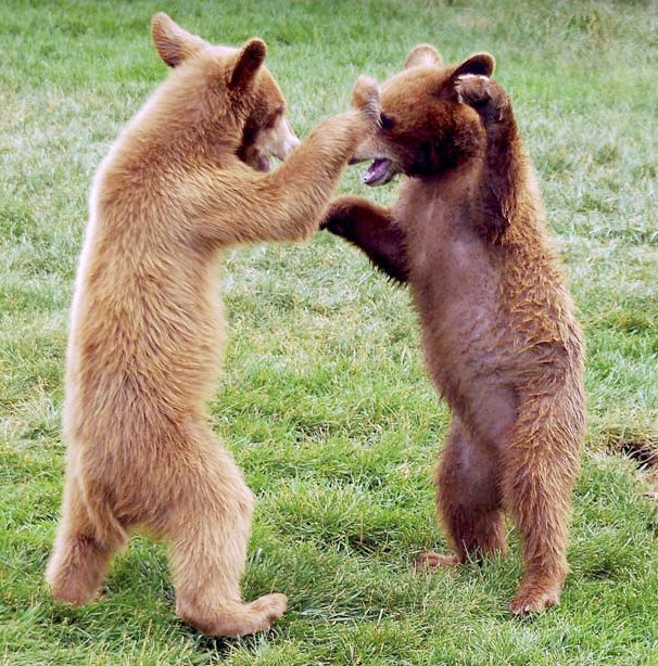 Hai chú gấu con đùa nhau tại công viên Gấu quốc gia ở nam Dakota, Mỹ.