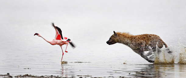 Linh Cẩu rượt đuổi hồng hạc tại hồ Nakuru (Kenya) hòng kiếm bữa ăn tối của mình. Tuy nhiên, nó không thể bắt được con chim này.