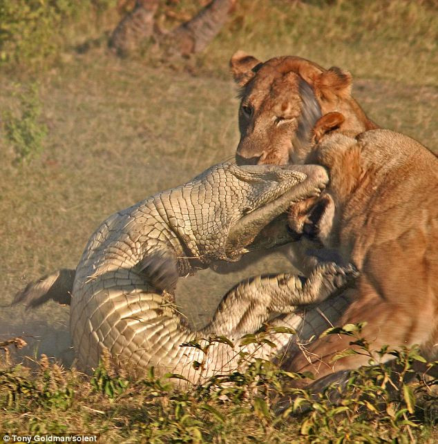 Ba con sư tử nhanh chóng xé xác con cá sấu sau khi phát hiện loài bò sát này chuẩn bị tấn công sư tử con. Ảnh được chụp lại bởi một bác sĩ tim mạch - Tony Goldman khi ông đag đi săn cùng con trai tại Botswana.