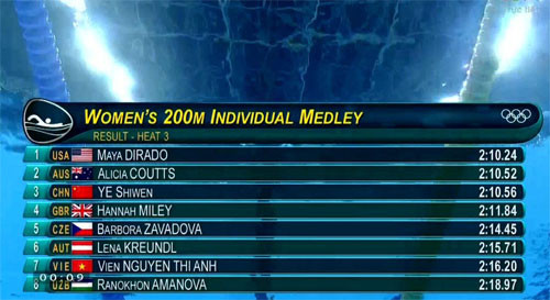 Ye Shiwen, đương kim vô địch và đang giữ kỷ lục Olympic ở nội dung này, về thứ ba ở lượt bơi này với thời gian 2 phút 10 giây 56. Ở ngày thi đấu đầu tiên, Shiwen thi đấu tệ và không thể bảo vệ chiếc HC vàng ở nội dung 400m hỗn hợp cá nhân. Thậm chí, kình ngư người Trung Quốc chỉ đứng thứ 27 ở vòng loại, kém xa Ánh Viên (thứ chín).