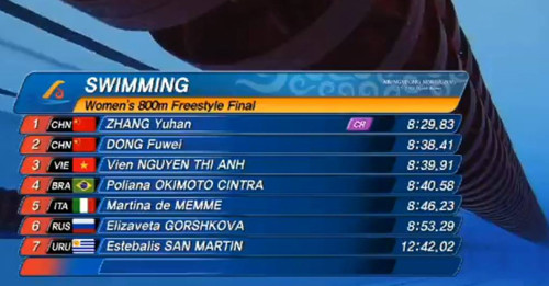 Ở chung kết nội dung bơi 800m tự do diễn ra chiều nay, Nguyễn Thị Ánh Viên được xếp ở làn đua số 1, tranh tài cùng 6 VĐV khác đến từ Trung Quốc, Brazil, Nga, Italy và Uruguay.