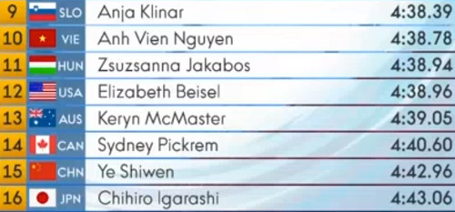 Ở lượt bơi vừa kết thúc Ye dẫn đầu trong 50m đầu tiên, nhưng đuối dần và về đích dưới cả Ánh Viên.
