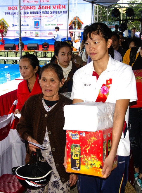 Các bạn trẻ không chỉ ấn tượng về thành tích và những câu chuyện mà chị Ánh Viên chia sẻ, mà còn quý trọng tấm lòng của nhà vô địch đối với người nghèo. Sau khi tặng quà cho 10 hộ gia đình có hoàn cảnh khó khăn do ảnh hưởng của trận lụt kéo dài, Ánh Viên đã ôm thùng quà và mang ra tận xe cho bà Trịnh Thị Hơn, 75 tuổi, quê ở xã Nghĩa Hà, TP Quảng Ngãi.