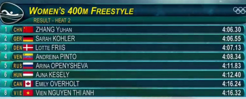 Hôm qua, Ánh Viên về nhất ở loạt bơi thứ ba vòng loại 400m hỗn hợp nữ, nhưng cũng không thể giành vé đi tiếp. VĐV thuộc biên chế quân đội sẽ còn tiếp tục tranh tài ở nội dung 200m hỗn hợp tại Olympic 2016.