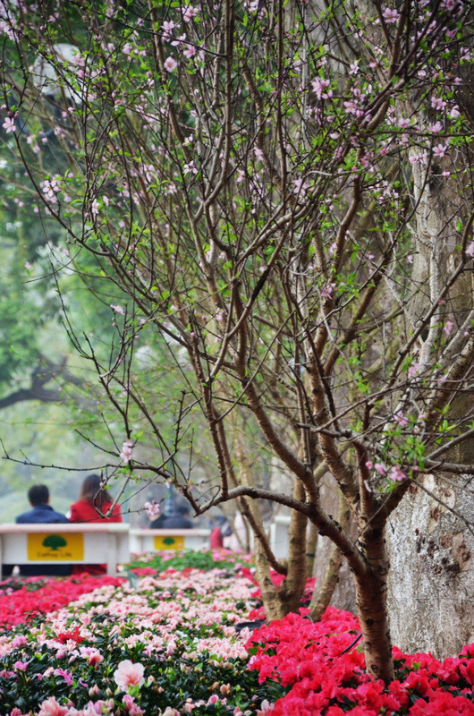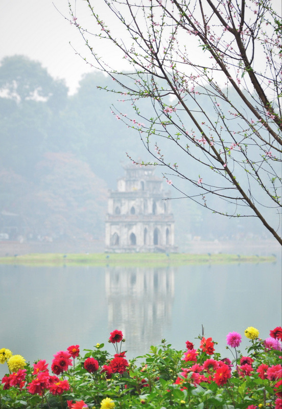 Còn 2 tuần nữa mới đến Tết Nguyên Đán Ất Mùi, nhưng khung cảnh khu vực trung tâm thành phố, đặc biệt là Hồ Gươm đã được khoác "áo mới" với rất nhiều cây hoa và đặc biệt là hàng trăm gốc đào rừng.