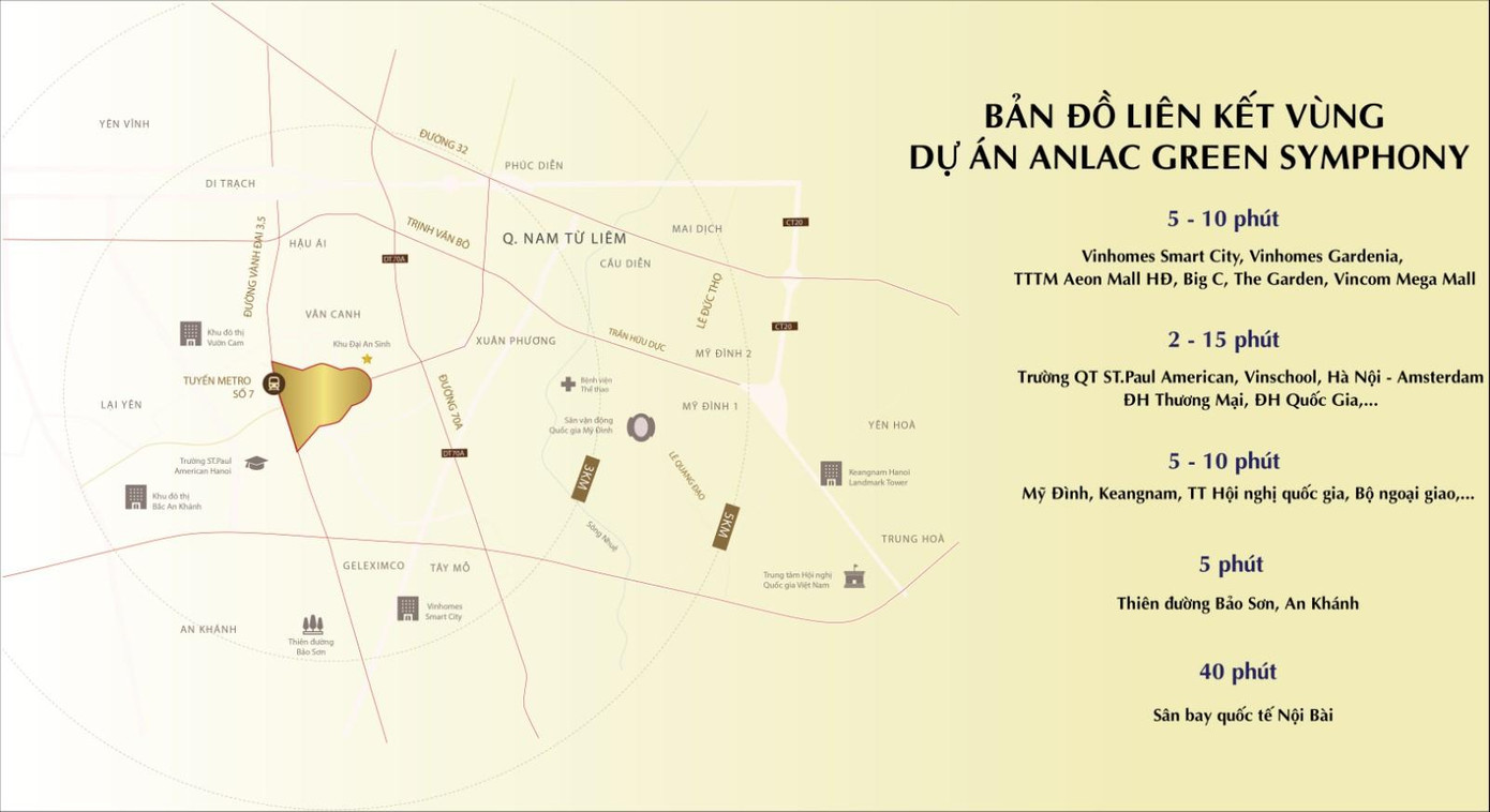 Thay vì phải chọn lựa giữa nơi sống đông đúc, tấp nập nhưng thiếu không gian xanh- riêng tư hay nơi có không gian xanh - riêng tư thì lại "yên tĩnh" quá, Anlac Green Symphony cân bằng cả 2 yếu tố khi mang đến cho cư dân không gian sống gần gũi với thiên nhiên mà vẫn nhộn nhịp nhờ các hoạt động kinh doanh sầm uất ngay trong nội khu. Cùng với đó là sự kết nối thuận tiện tới các khu vui chơi giải trí hay trung tâm hành chính của thành phố nhờ vị trí được xem là “trái tim của Mỹ Đình mở rộng”với hàng loạt tuyến đường huyết mạnh bao quanh.