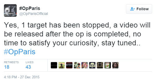 "Chúng tôi đang hoạt động âm thầm và đã chặn một cuộc tấn công Italy của phiến quân Nhà nước Hồi giáo. Chúng tôi hy vọng sẽ chặn được những vụ khác nữa", Anonymous chia sẻ trên tài khoản Twitter chính thức của nhóm là #OpParis. "Chúng tôi cũng đã đánh sập khoảng 1.000 tài khoản khủng bố mỗi ngày".