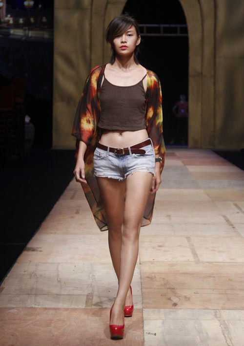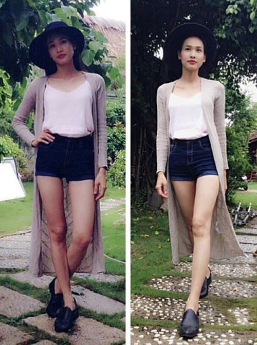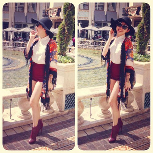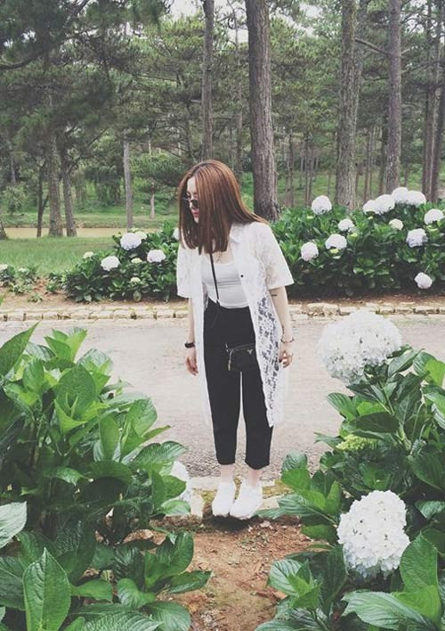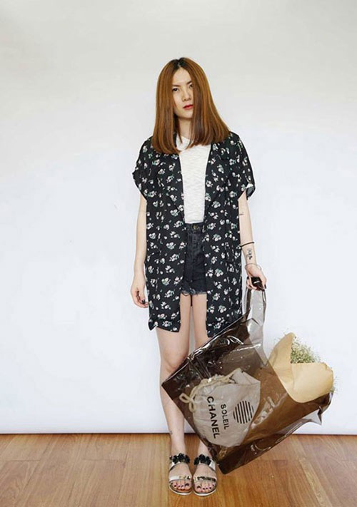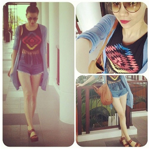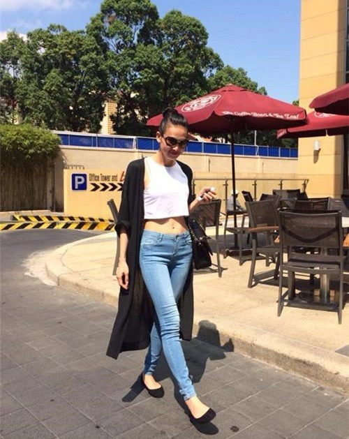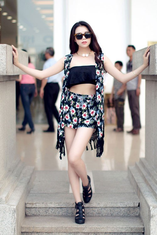 Phong cách kết hợp với áo khoác hè rất gợi cảm của Trà Ngọc Hằng.