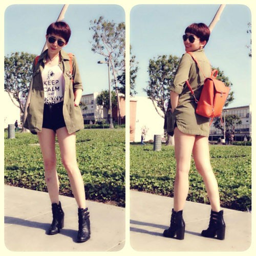 Tóc Tiên có một chiếc áo khoác mang phong cách quân đội rất cá tính và được cô kết hợp cùng đôi boot hầm hố.