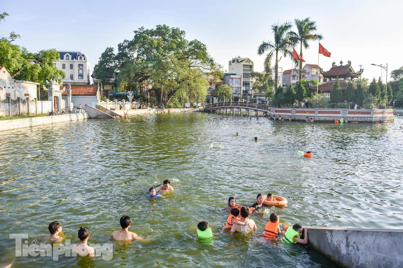 | Cứ khoảng 17h chiều, ao làng Thiên lại đông kín trẻ em đến bơi lội. Không chỉ là địa điểm thân thuộc của lũ nhỏ, cả người trung niên, người già trong xã cũng đến đây "giải nhiệt" những ngày nóng nực. |