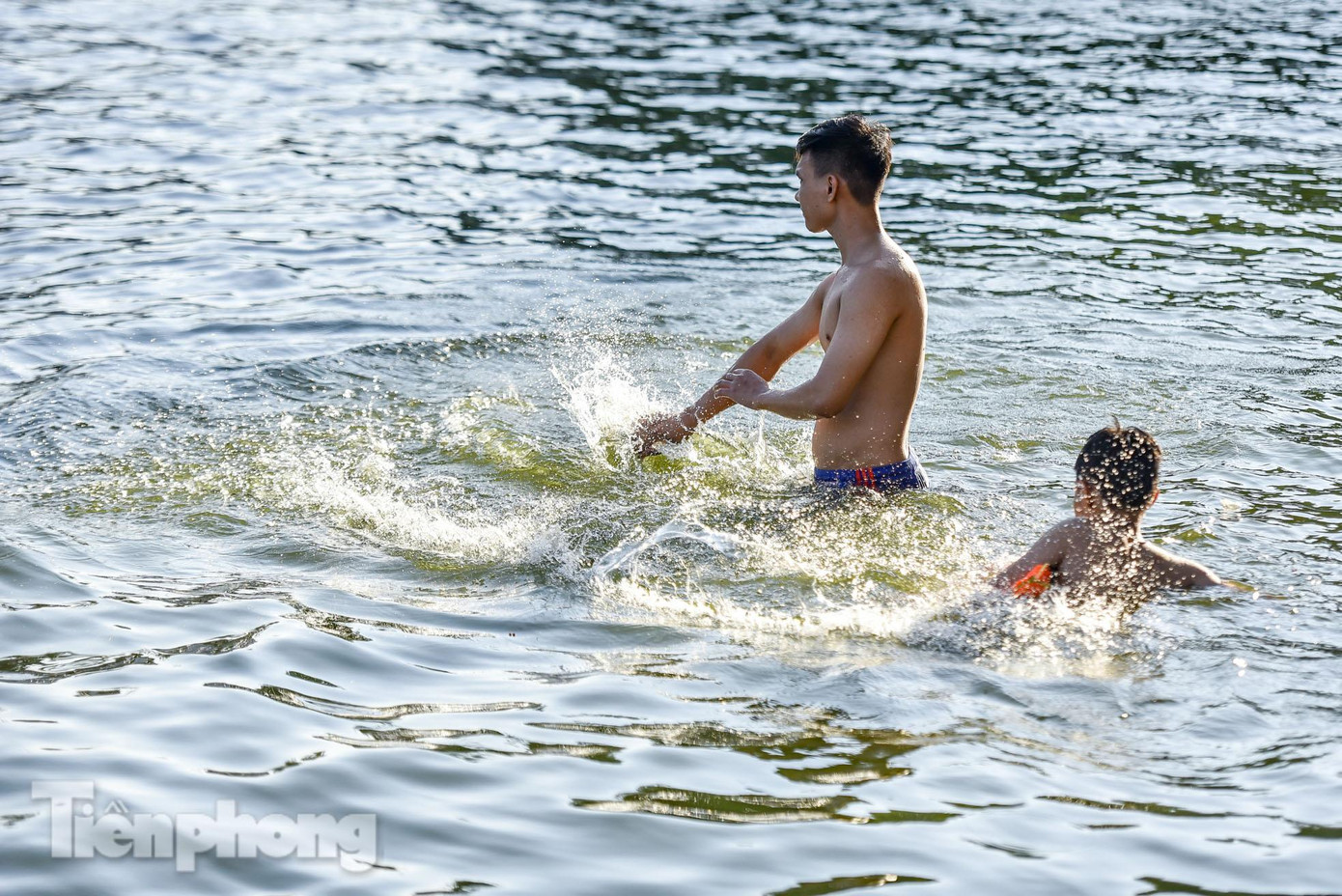 | Nhiều em nhỏ thôn Dương Liễu thích thú bơi lội trong làn nước xanh mát. |