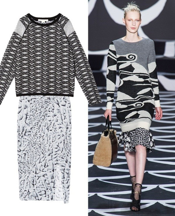 Ảnh phải: Gợi ý từ NTK Diane von Furstenberg với bộ trang phục nổi bật có những họa tiết đánh lừa thị giác. Ảnh trái: áo O'2nd giá 425USD, váy Helmut Lang giá 265USD.