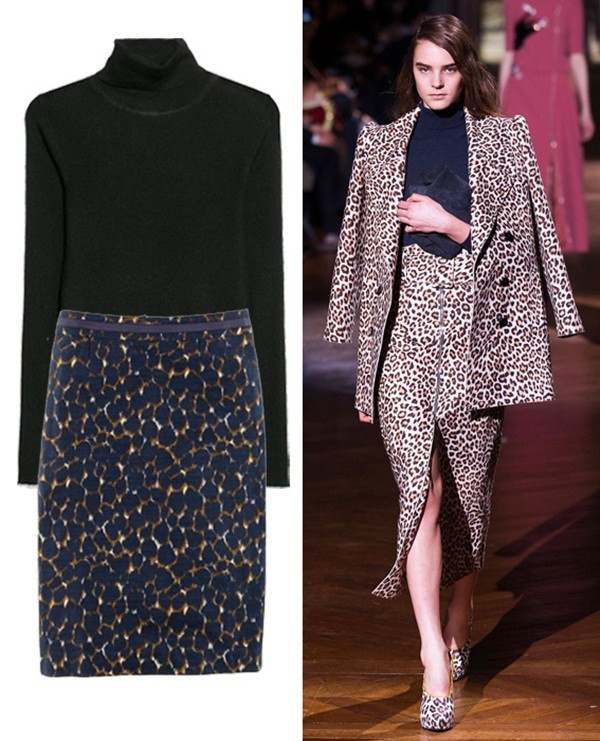 Ảnh phải: Một chút hoang dã với họa tiết da báo, sang trọng hơn khi được nhãn hiệu Carven kết hợp với những tông màu tối. Ảnh trái: áo Mango giá 40USD, váy Boden giá 71USD.