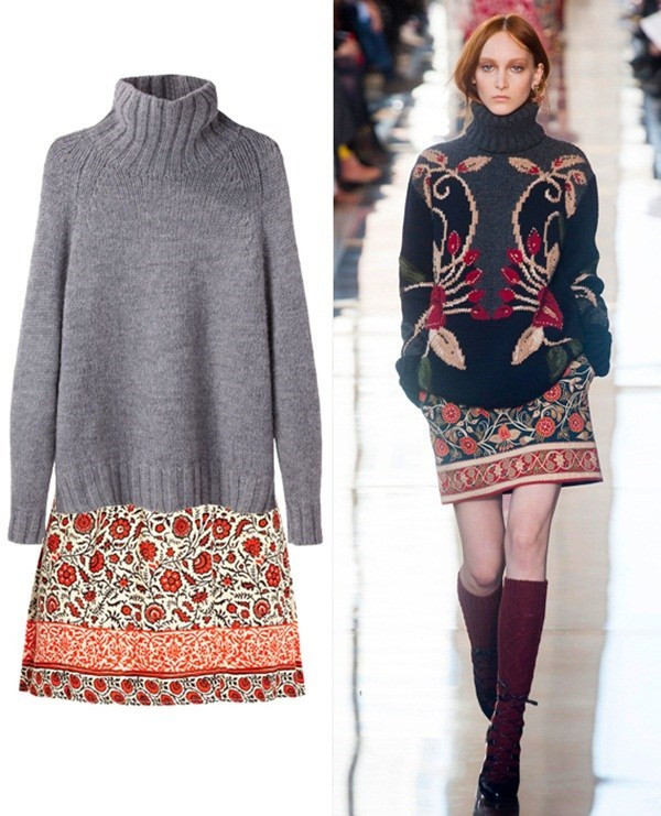 Ảnh phải: Cũng lấy cảm hứng từ họa tiết hoa cỏ, Tory Burch lựa chọn những màu sắc từ thời Trung cổ cho trang phục trong BST Thu Đông 2014-15. Ảnh trái: áo La Garconne Moderne giá 450USD, váy Forever 21 giá 15USD