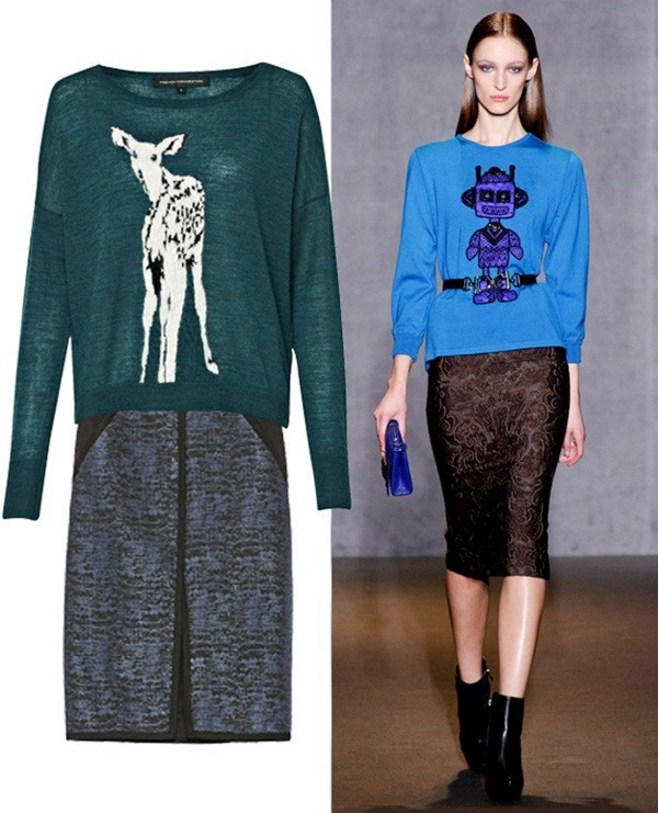 Ảnh phải: Các họa tiết ngộ nghĩnh trong thiết kế áo len của Andrew Gn được kết hợp cùng chân váy bút chì với họa tiết đối xứng mang sự đối lập nhưng vẫn tạo nên sự hài hòa ấn tượng. Ảnh trái: váy bút chì Jonathan Simkhai giá 395USD.