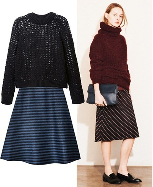 Ảnh phải: Tận dụng những đường kẻ sọc không bao giờ lỗi mốt, thương hiệu Elizabeth and James cũng lăng xê chân váy chữ A, tạo nên cảm hứng đầy lãng mạn cho những ngày cuối tuần mà cũng trang trọng thích hợp với các quý cô văn phòng. Ảnh trái: Áo 3.1 Phillip Lim giá 660USD