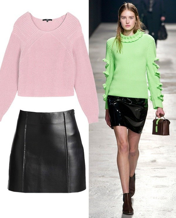 Ảnh phải: Xua đi sắc trời ảm đạm ngày đông với những màu sắc tươi sáng trẻ trung, đặc biệt là những gam màu pastel ngọt ngào theo gợi ý của Chiristopher Kane. Ảnh trái: áo Tibi giá 295USD, váy da Alexander Wang giá 595USD.