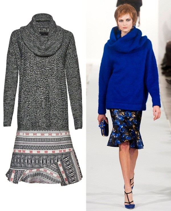 Ảnh phải: NTK Oscar de la Renta tạo nên sự quyến rũ hoàn hảo khi kết hợp chiếc áo cổ lọ với chân váy bút chì kiểu dáng ôm xòe hài hòa trong sắc xanh cobalt thống trị các sàn diễn thu đông. Ảnh trái: áo Alice+Olivia giá 330USD, váy Topshop giá 76USD.