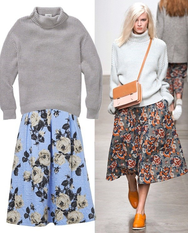 Ảnh phải: NTK Karen Walker biến hóa chiếc áo cổ lọ mềm mại hơn bằng chiếc váy midi xòe duyên dáng, tôn lên nét nữ tính mộc mạc mà tràn ngập trong sắc hoa ngọt ngào. Ảnh trái: áo Wilfred giá 165USD, chân váy Topshop giá 96USD.