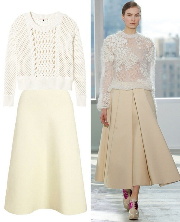Ảnh phải: Theo đuổi phong cách thanh lịch, quý phái, Delpozo đẩy mạnh các sắc độ trắng từ tinh khiết đến tông màu kem trong sự kết hợp áo dệt kim họa tiết ren và chân váy chữ A dáng dài. Ảnh trái: áo Rebecca Taylor giá 475USD, chân váy Whistles giá 255USD