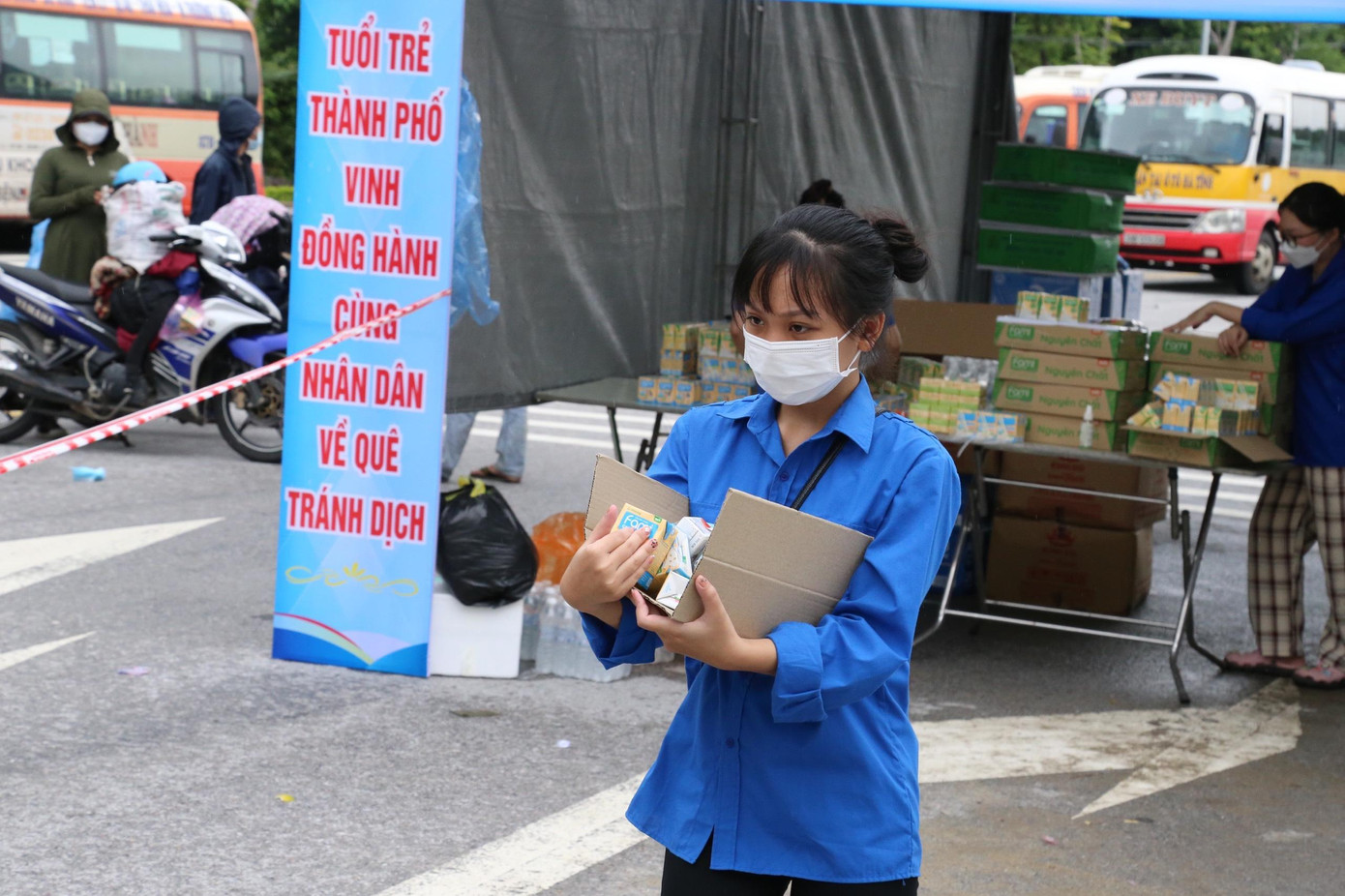 | Nhiều người từ các tỉnh thành phía Nam vẫn tiếp tục đổ về chốt kiểm soát cầu Bến Thủy 2. Với mong muốn tiếp sức người dân về quê, Thành đoàn Vinh (Nghệ An) triển khai điểm hỗ trợ an sinh tại đây. Hàng chục đoàn viên thanh niên tích cực tham gia, trong đó có nhiều bạn là học sinh, sinh viên. (Ảnh: Thu Hiền) |