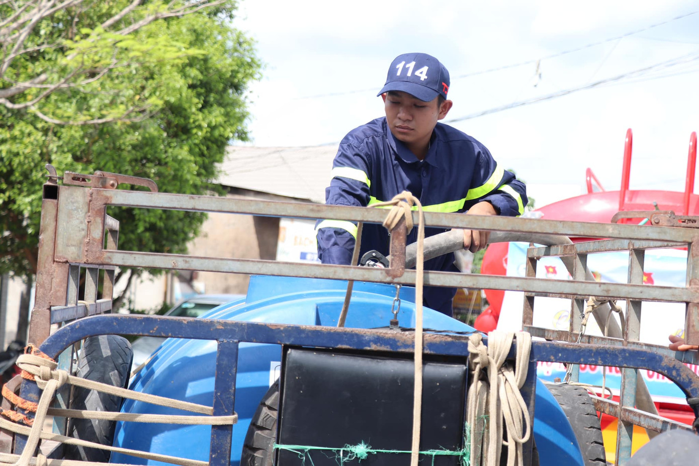 | Sau chương trình, có 4 lượt bồn chở nước từ xe chữa cháy được vận dụng cùng sự góp sức của các bạn đoàn viên, thanh niên Ban Thanh niên Công an tỉnh, Huyện đoàn Giồng Trôm, Xã đoàn Phước Long, các bạn sinh viên Trường Đại học Công nghệ TPHCM vận chuyển nước ngọt đến người dân xã Phước Long, huyện Giồng Trôm. |