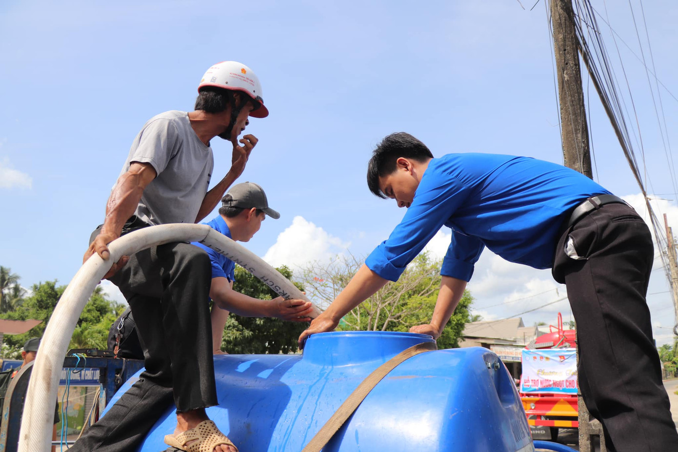 | Các bạn áo xanh tình nguyện tham gia hỗ trợ nước sạch cho người dân bị ảnh hưởng hạn mặn tại huyện Giồng Trôm, tỉnh Bến Tre. |