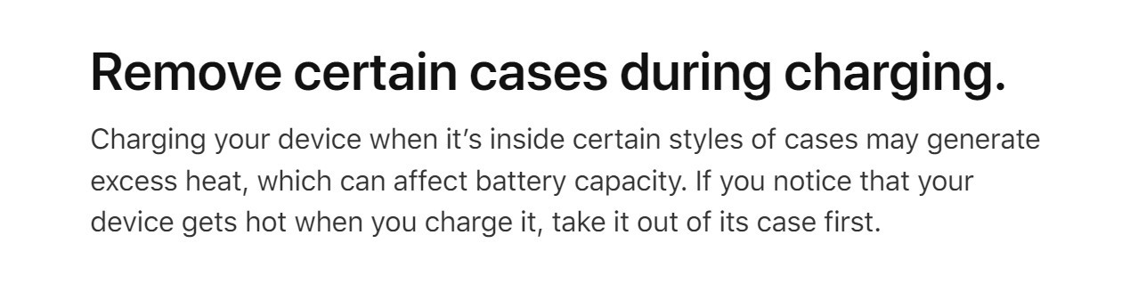 Lý do là một số loại ốp có thể dẫn đến tình trạng tồn đọng nhiệt lượng, dễ gây hại, làm chai pin nhanh hơn, thường là những loại ốp dày và tản nhiệt kém. Theo Apple, nếu thấy máy trở nên nóng bất thường, hãy tháo ốp lưng ra rồi mới tiếp tục cắm sạc.