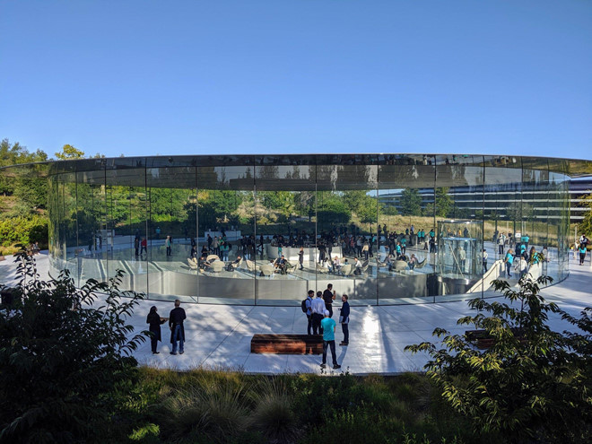 Khán phòng nơi tổ chức sự kiện ra mắt iPhone 2019 với logo Apple cắt lát nhiều màu sắc giống trong thư mời "Quả táo" gửi tới giới truyền thông cuối tháng trước.
