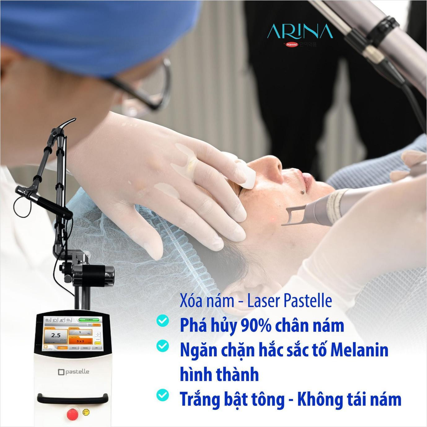 Với công nghệ Xóa nám Hanmi Melasma, Arina sẽ sử dụng hệ thống máy Laser Pastelle chuyên dụng có "mắt thần" nhận diện sắc tố, phá hủy có chọn lọc các hắc sắc tố hiện diện ở tầng trung và thượng bì nên không gây ra tình trạng tăng hoặc mất sắc tố, không làm tổn thương đến các mô xung quanh. Tích hợp công nghệ kháng nám số 1 tại Hàn Quốc, cấy tinh chất Hanmi Melasma thẩm thấu vào da, chặn đứng quá trình hình thành nám/ tàn nhang mới, đồng thời giúp da khỏe từ bên trong, bật tone da trắng mịn màng như thời 20 sau 1 liệu trình. Từ đó, rút ngắn ⅓ thời gian điều trị và khoảng cách giữa các lần điều trị so với các công nghệ cũ.