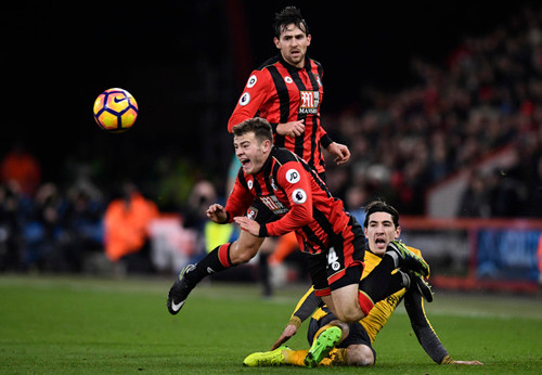 Trên sân Dean Court, Bournemouth nhập cuộc đầy máu lửa. Đoàn quân của HLV Eddie Howe di chuyển linh hoạt, chủ động đẩy cao đội hình tấn công. Sức ép liên tục được Bournemouth gia tăng và họ chỉ mất 16 phút để có được bàn thắng mở tỷ số. Phát hiện Bellerin bỏ vị trí, Junior Stanislas chuyền dài đổi hướng tấn công sang trái chuẩn xác cho Charlie Daniels. Hậu vệ trái này bẻ bóng tinh tế loại Bellerin đang lao về, trước khi tung cú sút hạ gục thủ thành Petr Cech.