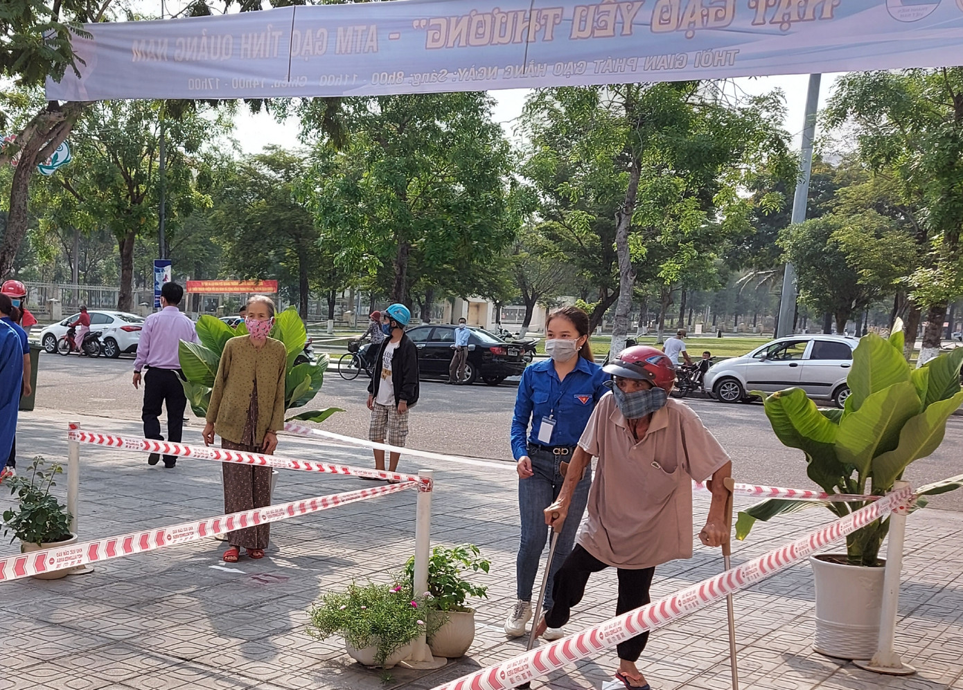 Cùng với 2 cây ATM gạo miễn phí do Hiệp hội Doanh nghiệp Quảng Nam tổ chức, chương trình phát gạo miễn phí cũng diễn ra tại số 2 đường Phan Đăng Lưu, TP. Tam Kỳ. Người dân đến đây ngoài nhận 3kg gạo miễn phí từ cây ATM, còn có phần quà là mì tôm, nước mắm. Các TNV tại đây hướng dẫn người dân thực hiện rửa tay sát khuẩn, kiểm tra y tế sau đó lần lượt xếp hàng để nhận gạo.