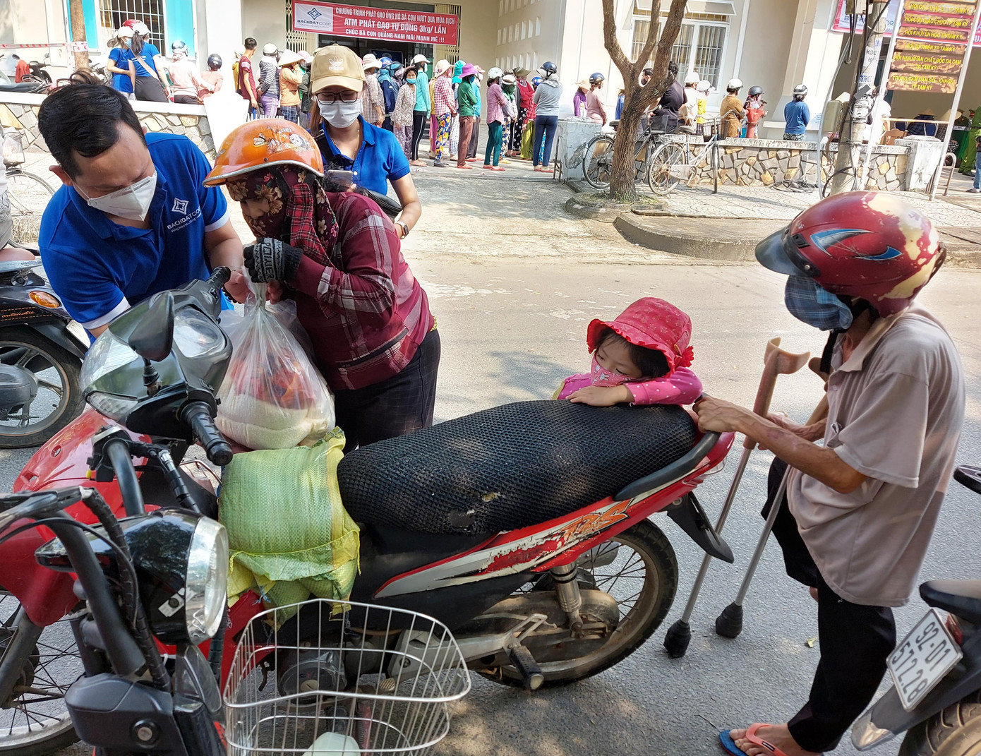 Sáng sớm, bà Võ Thị Thương (ở xã Tam Đàn, huyện Phú Ninh) đạp xe xuống điểm phát gạo miễn phí. Chồng mất, hằng ngày bà đi thu mua ve chai mưu sinh, nuôi 2 con nhỏ. Những ngày này, thực hiện giãn cách xã hội phòng chống dịch COVID – 19 nên không có thu nhập. “Người ta làm thu nhập cao có của nhã để dành thì không sao chứ dịch bệnh thế này dân nghèo thì lo lắm. Giữa lúc thế này 3 ký gạo chứ 1 ký cũng quý” – bà thương nói.
