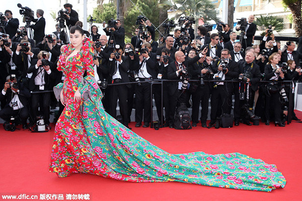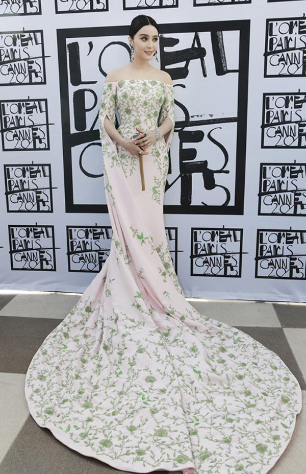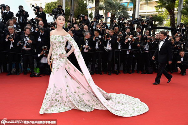 Trong khi các sao Hollywood như Natalie Portman, Charlize Theron... đều chọn váy áo sang trọng nhưng đơn giản khi xuất hiện trên thảm đỏ Cannes, thì dàn mỹ nhân Trung Quốc lại đi đến đâu là nổi đến đó. Phạm Băng Băng chịu khó đầu tư váy dạ hội siêu lộng lẫy để thể hiện đẳng cấp. Trong ngày đầu tiên tại Cannes, chiếc váy Ralph & Russo "ngốn" của cô đến hơn 3 tỷ đồng. Kiểu váy "tiên nữ giáng trần" trong ngày thứ hai tuy bị nhiều người chê "sến", nhưng cũng thành công khi giúp Băng Băng nổi bật trên thảm đỏ.