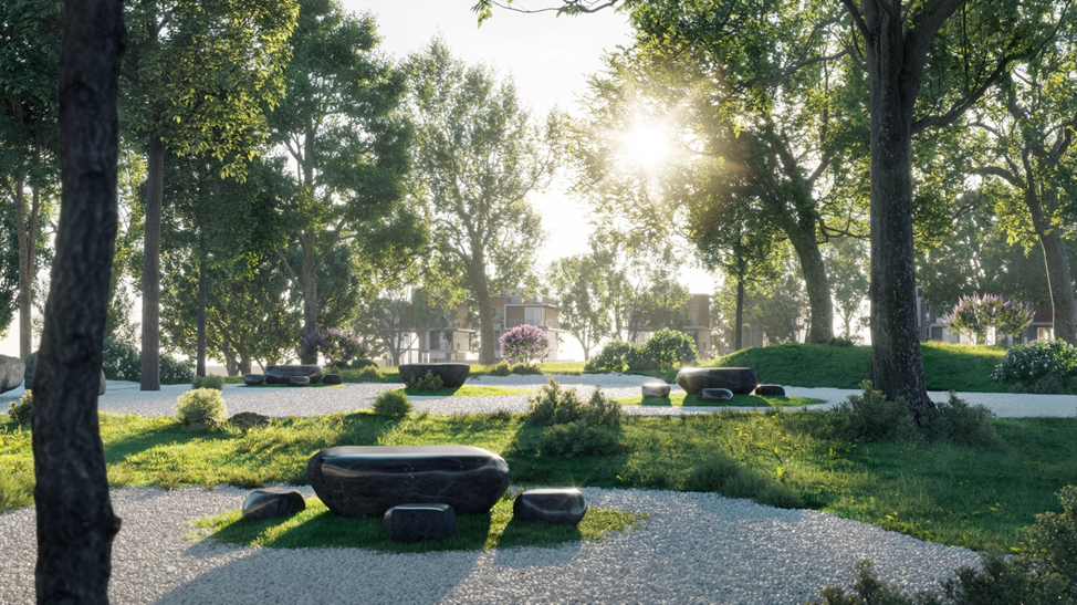 Để làm được điều này, tại công viên Riverwalk, CĐT thiết kế các khu vườn có chức năng riêng như: vườn đá chánh niệm, đường sỏi hành thiền, vườn thiền, vườn yoga, đường dạo thủy cực và đặc biệt nhất là vườn âm thanh được thiết kế với âm hưởng Rê- Mi, tần số 416-569hz sẽ giúp xóa bỏ tắc nghẽn tâm thức, cân bằng ADN, thôi thúc tình cảm, xóa bỏ tạp niệm.
