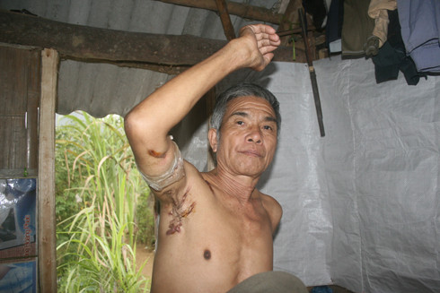 Ông Phiền không giấu nổi niềm vui khi từ cõi chết trở về, ông cởi phăng chiếc áo khoác phanh người cho chúng tôi xem. Những vết sẹo lỗ chỗ khắp người có mới có cũ, da hồng hào, mắt trắng chứ không vàng như mấy tháng trước đây.