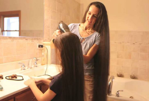 Chị Russell và cô con gái đầu, Lynn, có mái tóc dài nhất nhà. Riêng tóc chị dài khoảng 1,88m. Cô bé út, có mái tóc dài tầm 66cm.