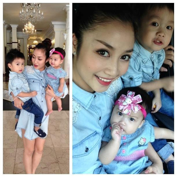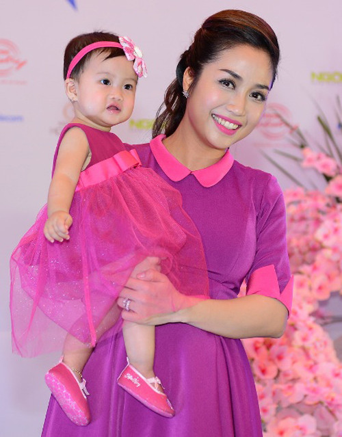 Gam màu tím hồng đầy nữ tính thường được Ốc Thanh Vân lựa chọn làm điểm nhấn cho trang phục của mình và hai bé Coca, Cola.