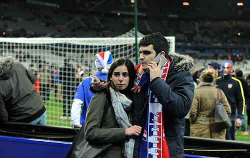 Cuối trận, các CĐV được yêu cầu không rời đi mà tập trung dưới sân do tình hình phức tạp bên ngoài. Trong hiệp một, các CĐV có thể nghe thấy hai tiếng nổ lớn ngay bên ngoài sân Stade de France. Theo tường thuật của Daily Mail, khán giả không chắc chắn là có đánh bom nhưng sự hoang mang và sợ hãi đã xuất hiện khi được thông báo cuối trận.