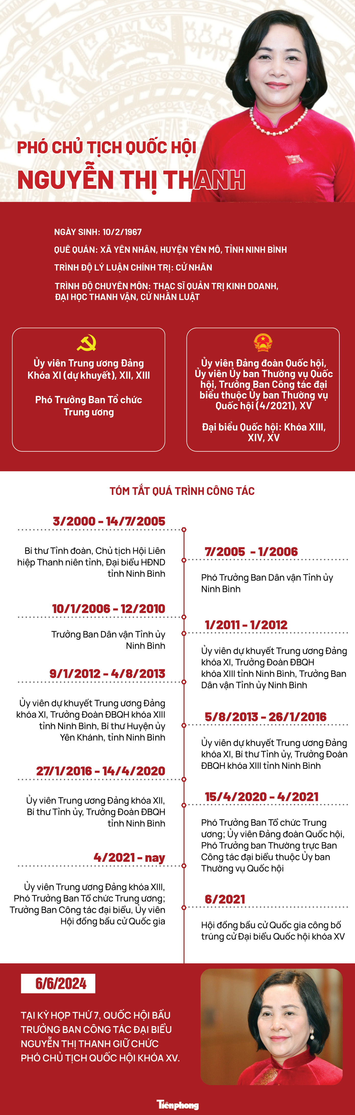 Nữ Phó Chủ tịch Quốc hội Nguyễn Thị Thanh sinh ngày 10/2/1967. Quê quán: Xã Yên Nhân, huyện Yên Mô, tỉnh Ninh Bình. Trình độ chuyên môn: Thạc sĩ quản trị kinh doanh, Đại học Thanh vận, cử nhân Luật.
